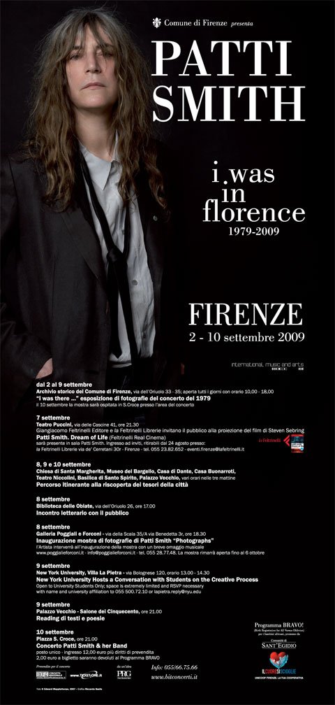 Un incontro con il pubblico fiorentino sui temi del futuro, della speranza e dell’arte come linguaggio universale ed infine il concerto con musicisti storici della vita artistica di Patti Smith nel quale eseguirà Horses e una carrellata delle sue canzoni più importanti e significative.