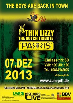 Die niederländische Thin Lizzy Tribute Band Parris hat sich ganz dem musikalischen Spirit von Thin Lizzy verschrieben. Mit großem Enthusiasmus, Energie und Liebe zur Rock-Musik lassen sie die Hits der Band wieder aufleben.