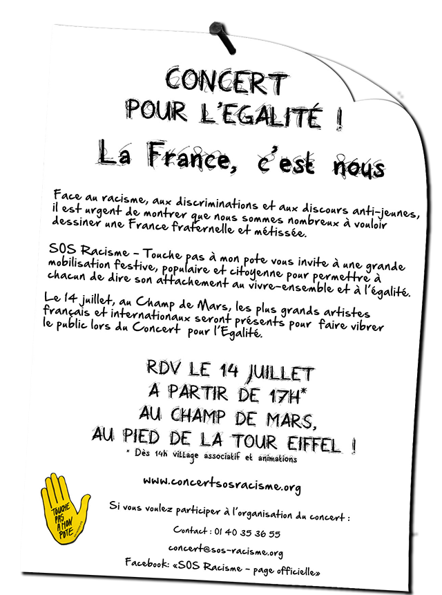 SOS Racisme vous invite à cette grande mobilisation festive, populaire et citoyenne pour rappeler à tous que chacun a pleinement sa place en France