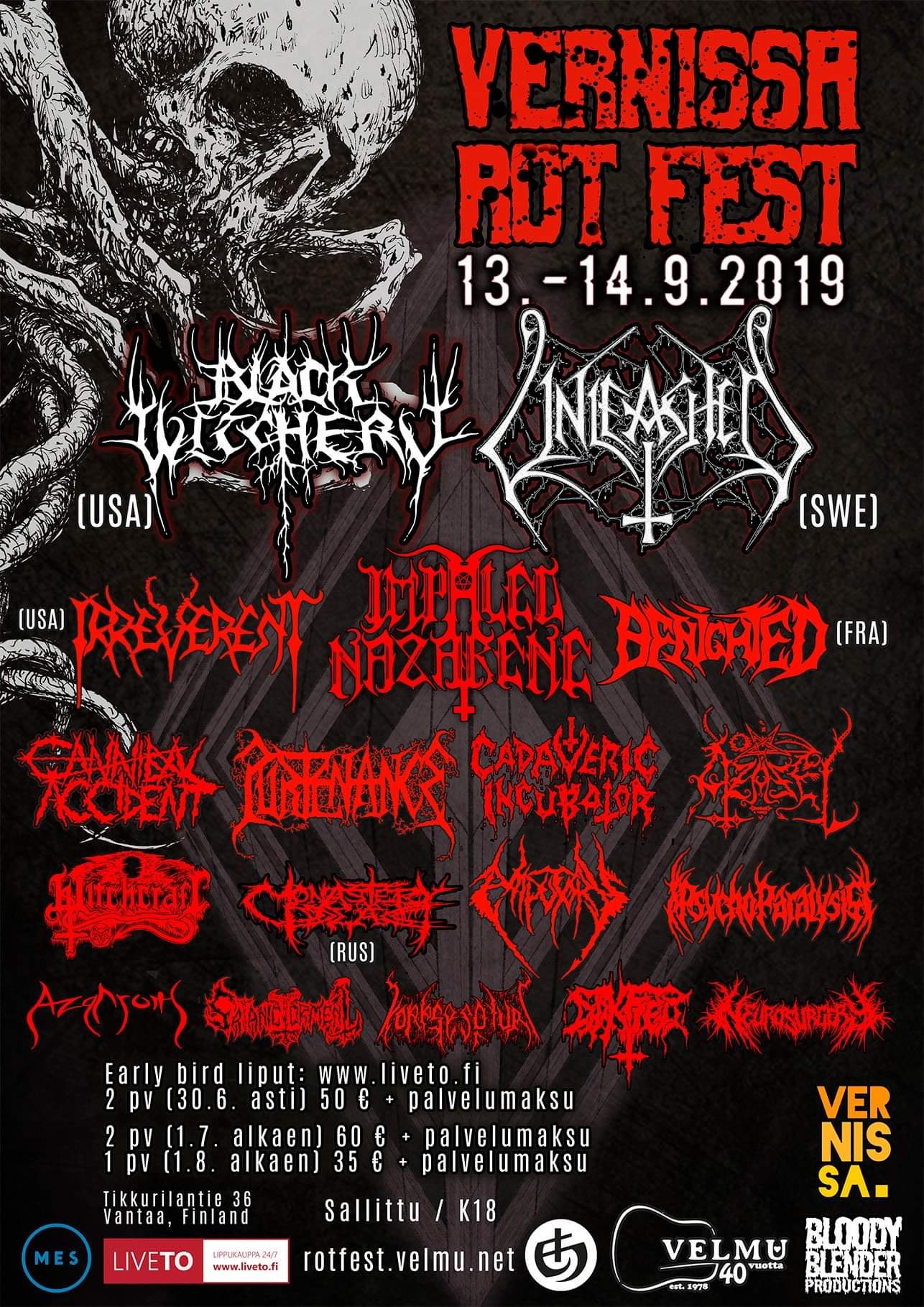 Velmu ry ja joukko vapaaehtoisia toimijoita pistävät kovat panokset pöytään, sillä näin vaikuttavaa äärimetallitapahtumaa ole ennen järjestety Vantaalla. Esiintymässä ovat mm. death metal legenda UNLEASHED (SWE), äärimmäistä raakuutta sylkevä BLACK WITCHERY (USA), mielipuoliset tykittäjät BENIGHTED (FRA), black/death metallia murjova Black Witcheryn esiaste IRREVERENT (USA) sekä kotimaiset CADAVERIC INCUBATOR, CANNIBAL ACCIDENT, AMPUTORY, (PSYCHOPARALYSIS), SATANIC TORMENT, NEUROSURGERY ja 8 muuta vielä julkistamatonta bändiä.