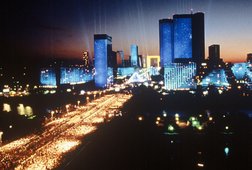 La Defense, it must be said, formed the perfect background, not simply because of its futuristic character, but also because of the tall skyscrapers, von Spreckelsens new Arc de Triomphe and steel monoliths which line the horizon visible from the centre of the city. Jarre designed a pyramid-shaped stage to fit the geometrical architecture of the setting where he performed with his musicians, a classical Arab ensemble (France’s second largest community), and others including a choir, a steel-drum band and gigantic dancing puppets of various kinds. The entire show was synchronised and illuminated by 65 tons of fireworks, as well as laser and light projections on the tall buildings. For over two hours Jarre enchanted yet another record live audience of 2.5 million people, and most of Paris was replete with electronic sounds and a sea of light on this festive July summer evening.