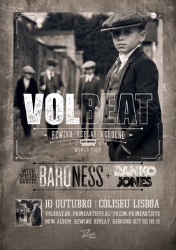Os multi-platinados roqueiros dinamarqueses VOLBEAT acabam de anunciar a primeira etapa da digressão mundial de promoção ao seu novo álbum, intitulado «Rewind, Replay, Rebound», que será editado no próximo dia 2 de Agosto via Vertigo Records. Tendo passado por Lisboa em 2010, a banda regressa agora à capital, com os norte-americanos BARONESS e os canadianos DANKO JONES como suporte, para a sua estreia em nome próprio. A atuação está agendada para o dia 10 de Outubro, no Coliseu dos Recreios, em Lisboa. Esta rota vê o quarteto passar também por cidades como Londres, Madrid, Berlim, Hamburgo e Estocolmo e os ingressos para todas as datas estarão à venda a partir de sexta-feira, dia 24 de Maio.