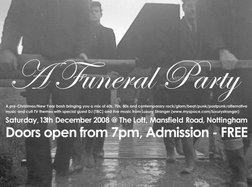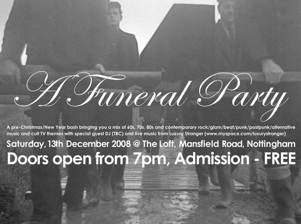 "Dancing at the funeral party..." A Funeral Party is a new and hopefully on-going event. Our idea is to play music from 60s beat bands through to 70s glam rock and 80s postpunk and onwards to contemporary alternative rock. We will also plan to feature one or two live bands. The 1st event is to take place at Loft on Mansfield Rd, Nottingham on Saturday, 13th December 2008. There will be a special guest DJ (TBC) as well as live music from new Nottingham band Luxury Stranger (who I managed to talk into taking part after watching their electric live debut at Junktion 7). Doors open from 7pm and the event is FREE! Hope to see you there.