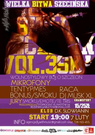 Wielka Bitwa Szczecińska #3 !!! Już 7 lutego w klubie Słowianin odbędzie się trzecia edycja freestylowej bitwy o Szczecin. Jak co roku, do stolicy zachodniego pomorza zjadą się najlepsi freestylowcy w Polsce. Ich sceniczne zmagania oceniać będzie trzy osobowe jury w składzie: Smoku (Szczecin), Emote (Gdańsk) oraz legenda polskiego freestylu, który dla WBS #3 wrócił do jury TETRIS! Ponadto na scenie Słowianina zobaczycie świetnie obsadzone koncerty. Za mikrofonami pojawi się: szczeciński duet Bonus/Smoku, Raca (ToSięWytnie) oraz gwiazda wieczoru członek zespołu Flexxip i 2cztery7 TEN TYP MES. Impreze za gramofonami zagra Musk XL.