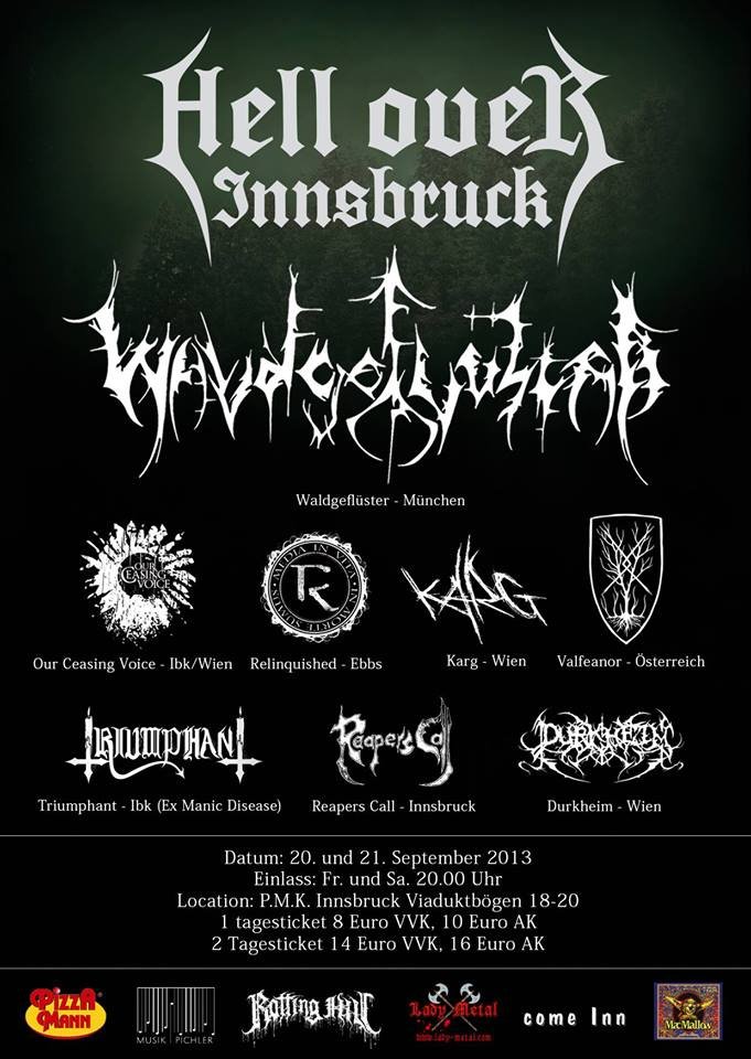 Nach den Erfolgen der letzten beiden „Hell Over Innsbruck“ Veranstaltungen, findet heuer die dritte Ausführung statt, und das größer denn je zuvor. Inzwischen haben wir das Festival nämlich auf 2 Tage ausgeweitet, und sowohl am 20. als auch am 21. September wird das P. M.K. Schauplatz eines atemberaubenden (und vielseitigen) Black Metal Spektakels. Mit dabei sind diesmals WALDGEFLÜSTER, OUR CEASING VOICE, KARG, VALFEANOR, RELINQUISHED, TRIUMPHANT (Ex Manic Disease), DURKHEIM und REAPER’s CALL!