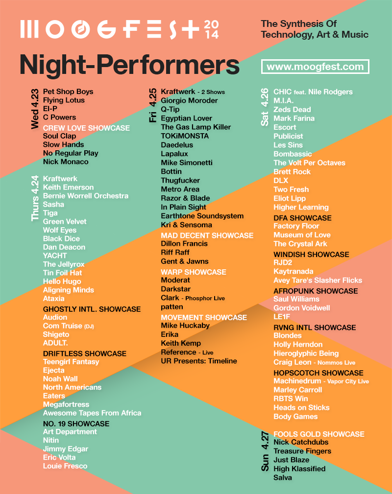 Moogfest is a five-day music festival and conference dedicated to exploring technology, art and music, honoring the creativity and inventiveness of Bob Moog and paying tribute to the legacy of the analog synthesizer through a platform of events both day and night.