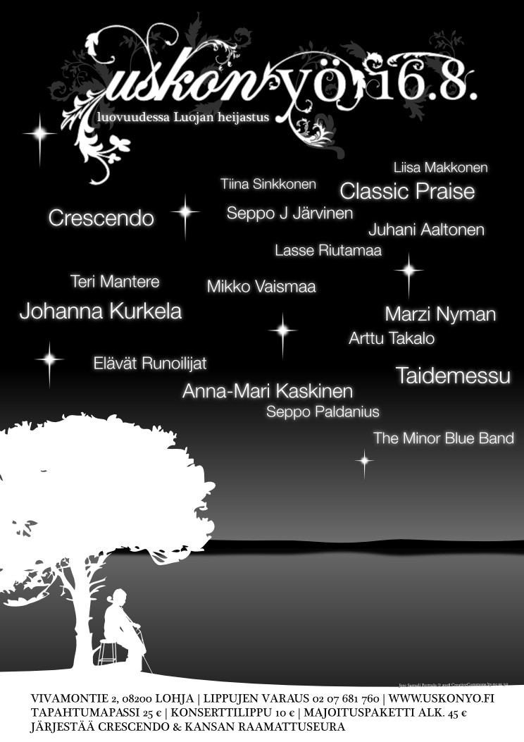 Ohjelma alkaa tänä vuonna klo 14 tilaisuudella nimeltä Luojan luova hulluus, jonka sisällöstä vastaavat Marzi Nyman, Arttu Takalo, Teri Mantere, showtanssin MM Mikko Ahlgren sekä koomikko Mikko Vaismaa. Iltapäivä jatkuu The Minor Blue Bandin keikalla. Juhlateltassa klo 18 kuullaan Suomea kiertänyt Classic Praise -konsertti, jossa pianisti Seppo J Järvisen johdolla esitetään mm. suomalaista ja israelilaista ylistysmusiikkia laulukvintetillä ja soitinensemblellä. Kirkkokonsertissa "Luovuudessa Luojan läsnäolo" klo 20.30 kuullaan Prokofjeviä ja Sibeliusta huilisti Eveliina Laineen esittämänä ja teltassa klo 22 lavan valloittaa Johanna Kurkela. Eri kohteissa voi ihailla myös valokuvanäyttelyitä, lyhytelokuvia sekä illan hämärtyessä valotaideteoksia.