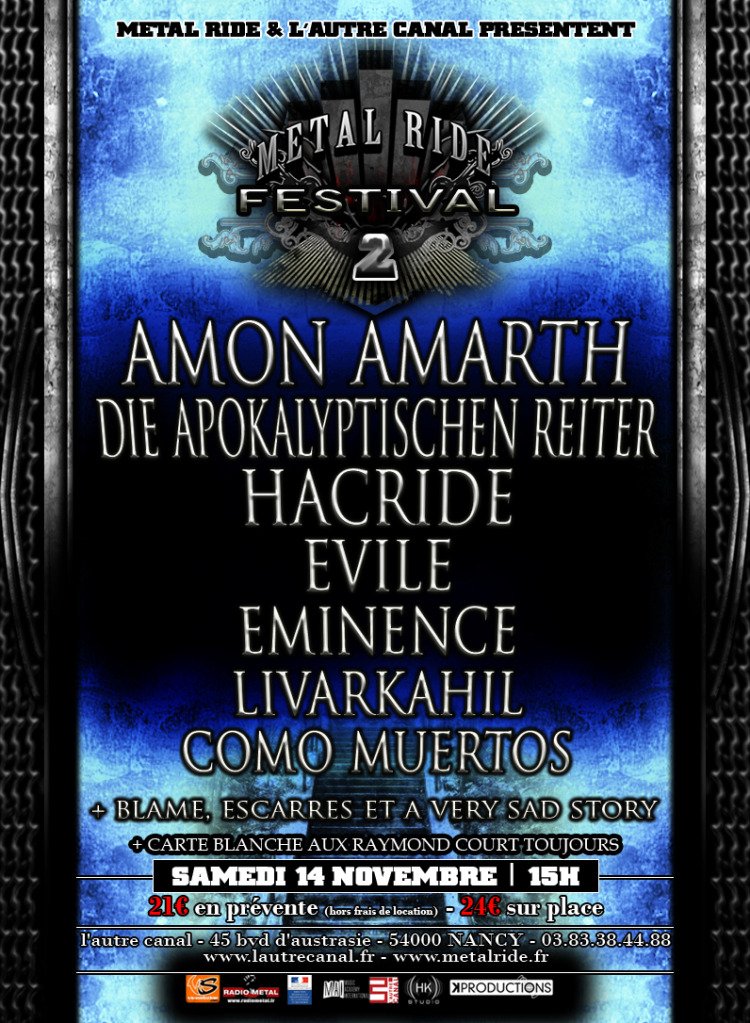 Cette année , plusieurs groupes de renommées internationale seront présent , sans oublier que Metalride pense aussi à la Scène locale en proposant un tremplin pour 3 groupes venu de Lorraine. Le tout pour un prix à portée de tout le monde pour une soirée mémorable.