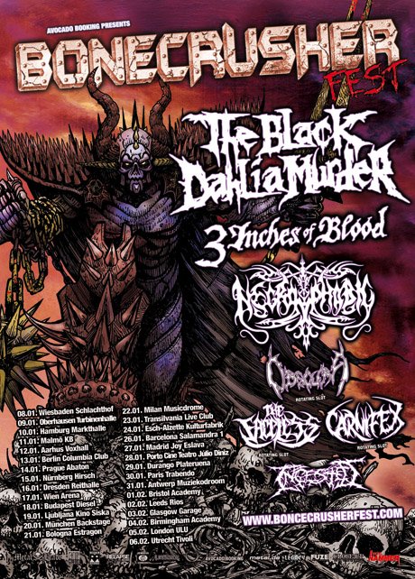 THE BLACK DAHLIA MURDER's singer Trevor Strnad has this to say: "We are very excited to be the drunken hosts of the Bonecrusher tour. In cooperation with the wonderful Avocado, we have assembled quite a brutal line up for all tastes of the extreme. We are to be joined in this merciless campaign by our bearded brethren in 3 Inches Of Blood, personal favorites Necrophobic, Carnifex, Obscura, The Faceless and one of the UK's finest, Ingested. You'd be a fool to miss such a killer line up! Come out to the show and leave in an urn... bones crushed!!!"http://viewmorepics.myspace.com/index.cfm?fuseaction=viewImage&friendID=495253535&albumID=557588&imageID=3659335