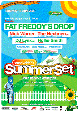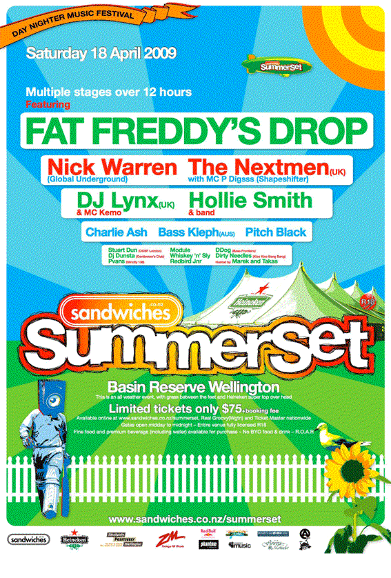 Sandwiches is pleased to announce a stellar line up led by big hitter Fat Freddy’s Drop for Sandwiches Summerset 09 Day-Nighter at Wellington’s iconic Basin Reserve.