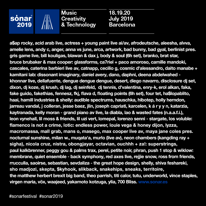 The 26th edition of Sónar in Barcelona will be an extraordinary celebration, presenting a total of 130 shows on 18, 19 and 20 July 2019 at the venues of Sónar by Day (Fira Montjuïc de Barcelona) and Sónar by Night (Gran Via de L'Hospitalet). The festival will return in 2020 to its usual dates in the month of June.