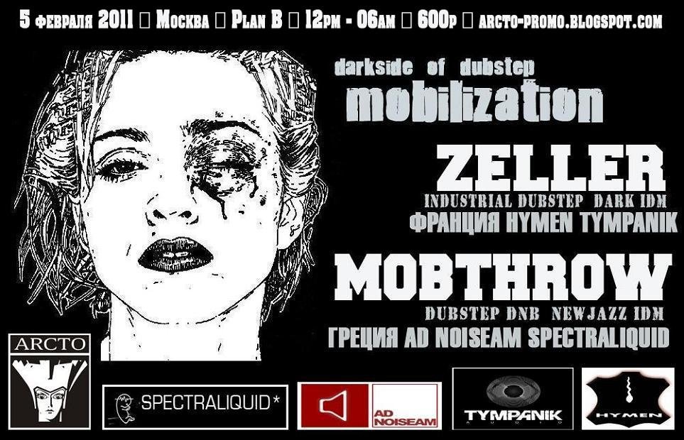 • Деконструкцию классического представления о дабстепе и вскрытие темных иррефлексивных сторон этого стиля будут осуществлять два наших гостя, чьи релизы представлены на авторитетнейших лейблах европейской и американской пост-индустриальных сценах - мы говорим о французском проекте Zeller (Tympanik / Hymen – Ant-Zen), чей последний альбом "Turbulences" стал одним из главных в череде новинок от Тимпаника, и греческом проекте Mobthrow, который приезжает в Россию с презентацией нового альбома (официальная дата релиза - 1 февраля 2011), анонсированного Ad Noiseam. Поддержку окажут наши друзья и соратники - dj Brainfilter, dj Nima, djEarectorr, vj Antishanti, Retard Clan (live), Elvis shot JFK (live).