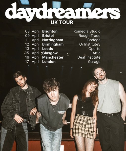 daydreamers live for those moments when a crowd of strangers forgets its troubles in favor of smiling and singing along. The UK quartet — Riley , Aurora Mannola , Jay Lewis , and Marco Bastianoni —pacify anxiety, stress, and heartbreak with balmy guitars, sunny melodies, shimmering ethereal soundscapes, and kind of nostalgia typically reserved for the big screen.