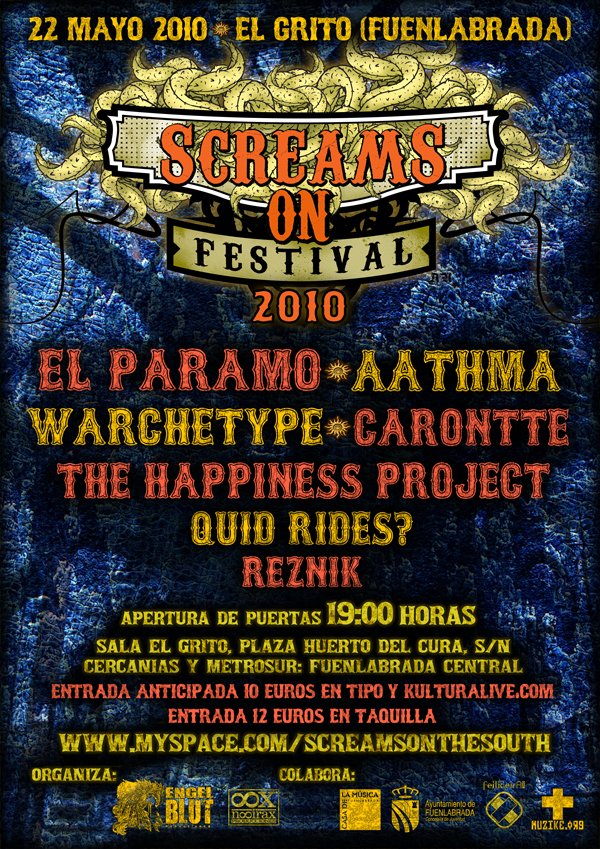 Segunda edición del festival que se celebrará el 22 de Mayo en la ciudad de Fuenlabrada al sur de Madrid. Contará con las actuaciones de Reznik, Hand of Fatima, The Happiness Project, Carontte, Aathma, Warchetype y El Páramo. La sala El Grito será el lugar elegido para la celebración del evento. Una sala céntrica en la ciudad de Fuenlabrada, con una capacidad para más de 600 personas, perfectamente comunicada por RENFE, Metro Sur (300 m. de Fuenlabrada Central) y autobuses directos a Madrid (100 m.) Para el evento se habilitaran dos escenarios, en los que las bandas podrán efectuar rapidamente los cambios. Pero eso sí, la sala permitirá la salida y entrada de los espectadores al recinto, a través del contiguo parque del Huerto del Cura. Los precios de la bebida tampoco tienen rival. 2 euros el tubo de cerveza y 5,5 euros el mini de cerveza o kalimotxo.