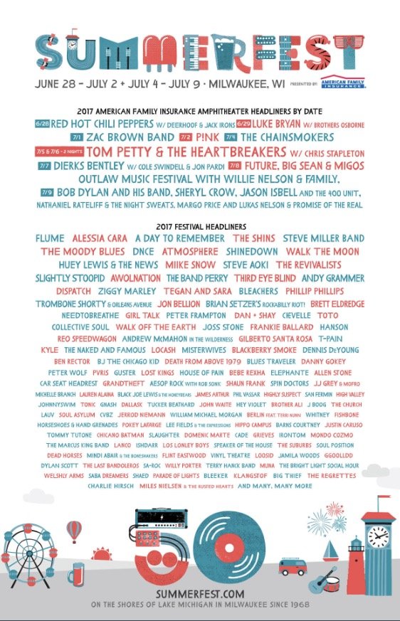 Summerfest is an annual, 11 day music festival located on the shore of Lake Michigan at the Henry W. Meier Summerfest Grounds in Milwaukee, WI. Admission to the fest is $20 each day and includes access to acts on many different stages. Each night’s headliner plays at the Marcus Amphitheater for an additional cost (this cost does include admission to the regular festival).