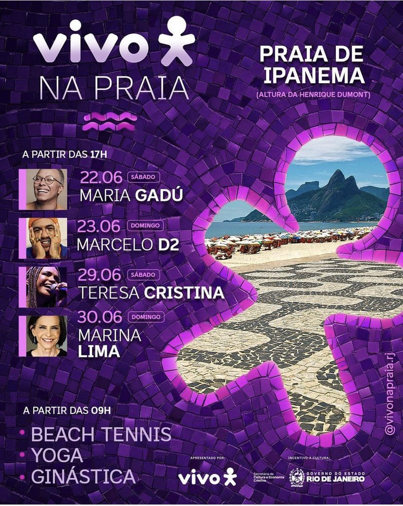 🎶☀️ Pôr do sol inesquecível + show do artista que você ama = Vivo na Praia!☀️ Prepare-se para vivenciar momentos mágicos com Maria Gadú, Marcelo D2, Teresa Cristina e Marina Lima na praia mais charmosa do mundo! Os artistas fazem parte da programação do Vivo na Praia, que acontece nos dias 22, 23, 29 e 30 de junho nas areias de Ipanema, Posto 10 (altura da Henrique Dumont). 𝗔 𝗽𝗮𝗿𝘁𝗶𝗿 𝗱𝗮𝘀 𝟭𝟳𝗵.